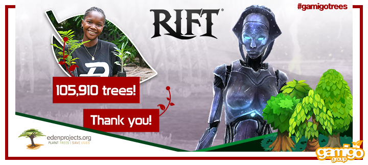 On behalf of gamigo and our partners at Eden Reforestation Projects, the Rift team would like to thank you for helping to make a difference. Together, we were able to achieve 105,910 trees pledged!